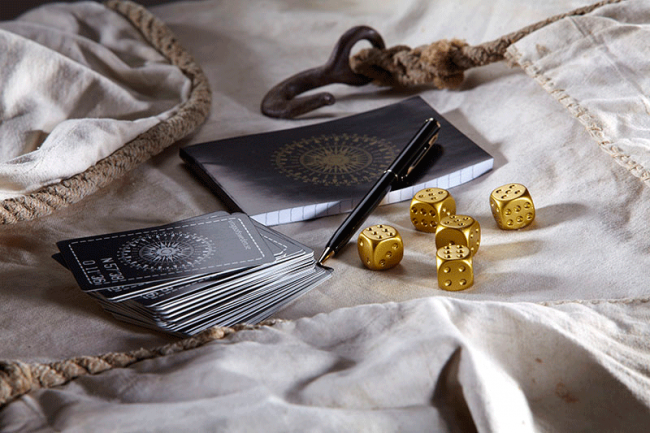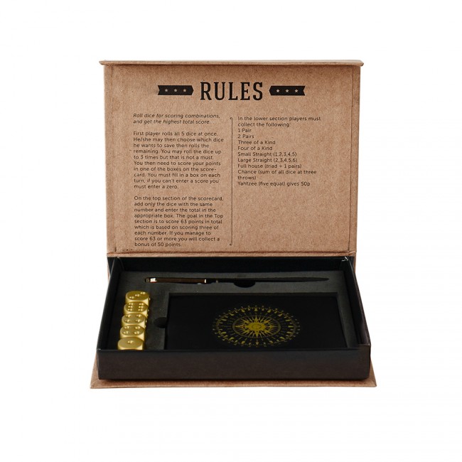 Pimpat yatzy med fem tärningar och penna i ”guld” samt noteringsblock. Strl. 18x14x3 cm. Förp. Presentkartong.
