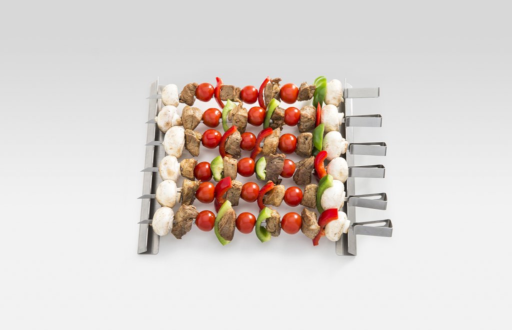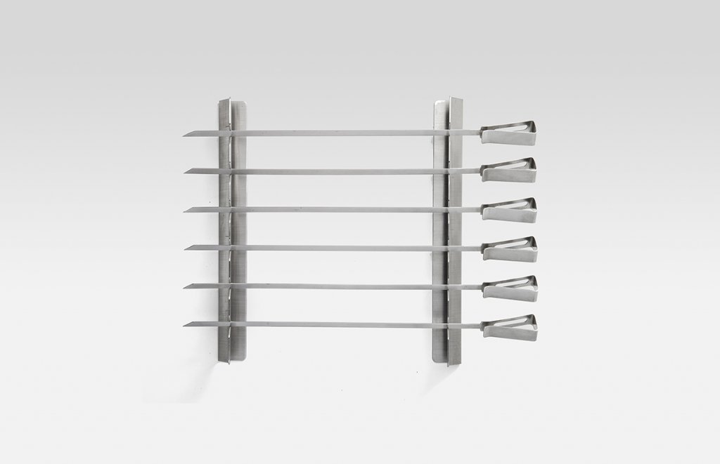 Ett revolutionerande set med 6 grillspett och en ställning att lägga spetten på, vilket gör det enkelt att vända spetten och inget fastnar i grillgallret. Nu kan du lätt grilla ditt kött, fisk och även grönsaker som tomater utan att dom ”rullar” runt eller trillar ner i grillen. Exklusiva och gedigna grillspett noga utvalda av Leif Mannerström gör grillningen till en ren njutning. Tillverkade av högsta kvalitet i 18/10 rostfritt stål. Spettens längd är 36 cm. Setet ligger i en exklusiv presentkartong.
